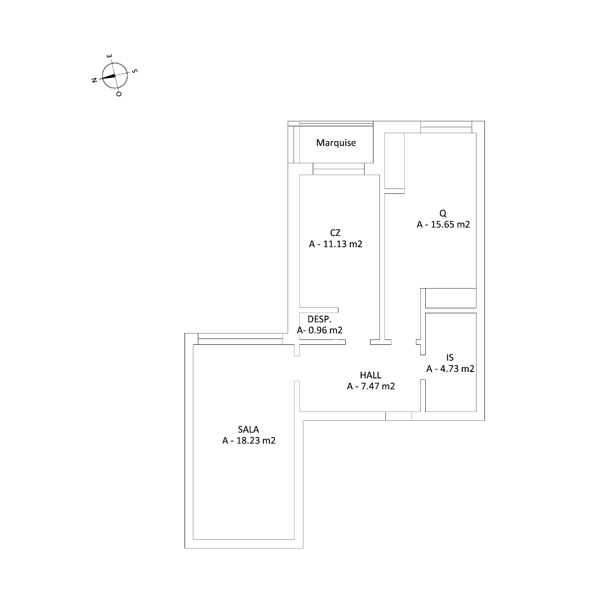 Apartamento T1 de 2 assoalhadas com área útil de 64m2 e area bruta de 73m2 referente à Marquise/Varanda e Arrecadação.